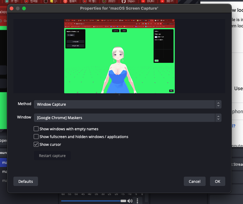Window Capture๋ก ์ ํํด ์ฃผ๊ณ Window๋ ์๊น Maskers ์ฐฝ์ผ๋ก ์ง์ ํด ์ค๋๋ค. OK๋ฒํผ์ ํด๋ฆญํด์ ์์ํด ์ค๋๋ค.