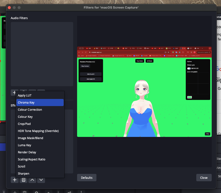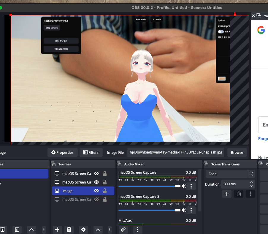 ์ด๋ ๋ง์ค์ปค์ค์์ ์ฐ์ธก ํ๋จ Play ๋ฒํผ์ ํด๋ฆญํด์ฃผ๋ฉด ๋ง์ค์ปค์ค์ UI๊ฐ ๋ชจ๋ ํฌ๋ช ํด์ ธ์ ๋ชจ๋ธ๋ง ๋จ๊ฒ ๋ฉ๋๋ค. ์๋์ฒ๋ผ OBS ๋ฐฐ๊ฒฝ์ ์ด๋ฏธ์ง๋ฅผ ์ถ๊ฐํด ์ฃผ๋ฉด ์์ฑ์ ๋๋ค. ์ด์ OBS์์ ๋ฐฉ์ก์ ํด๋ฆญํด ์ฃผ๋ฉด ์ ์์ ์ผ๋ก ๋ฐฉ์ก์ด ๊ฐ๋ฅํฉ๋๋ค.