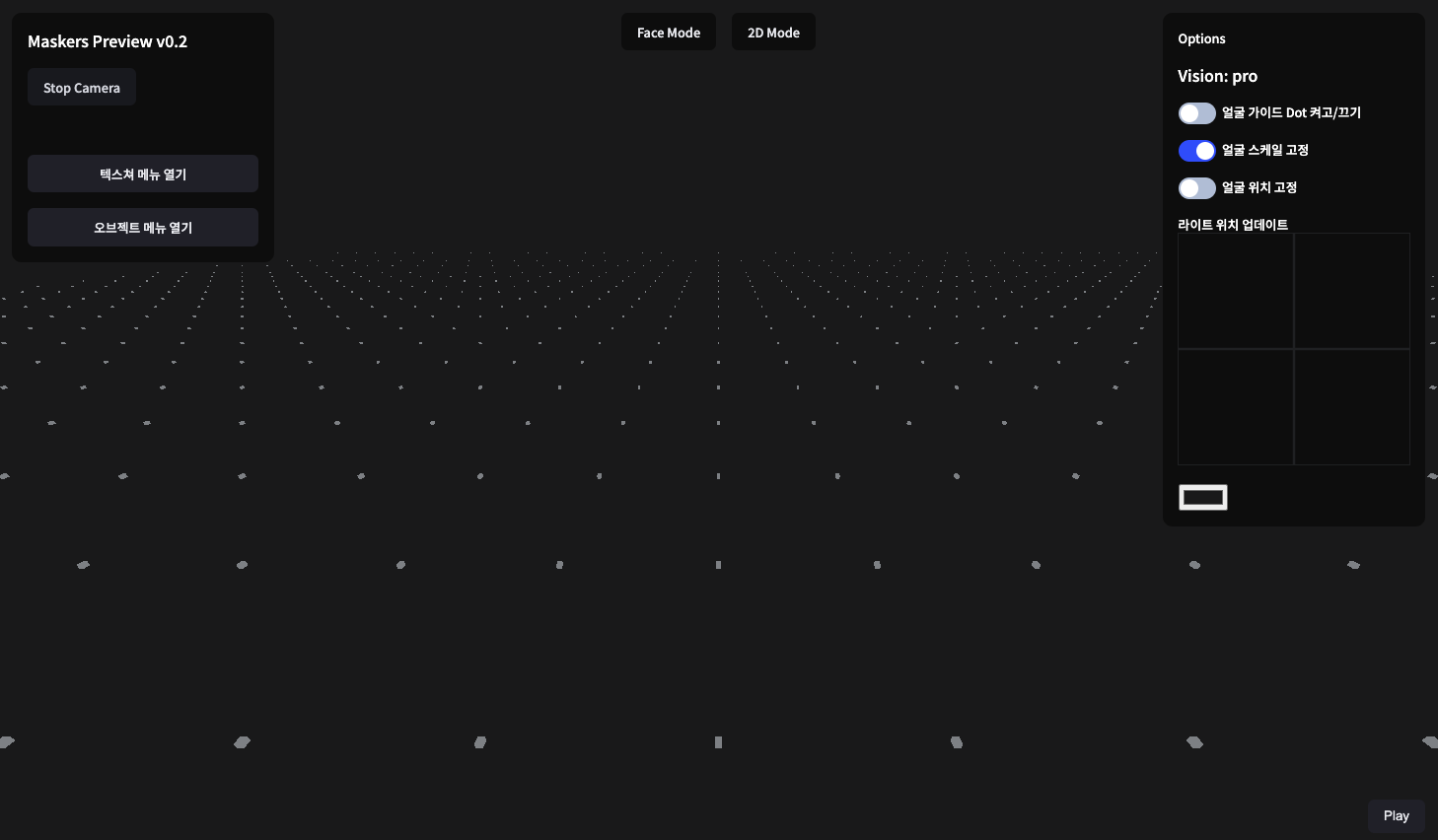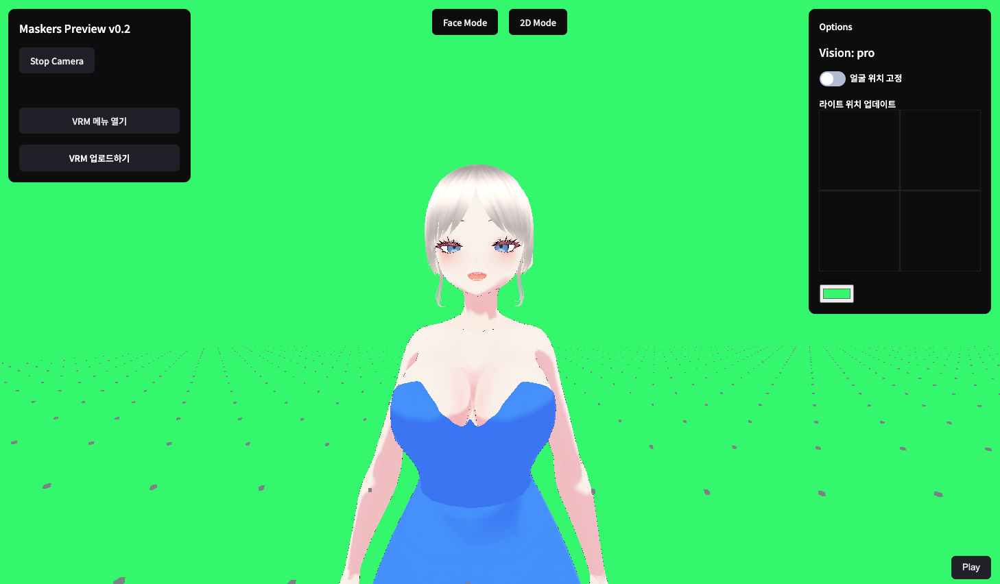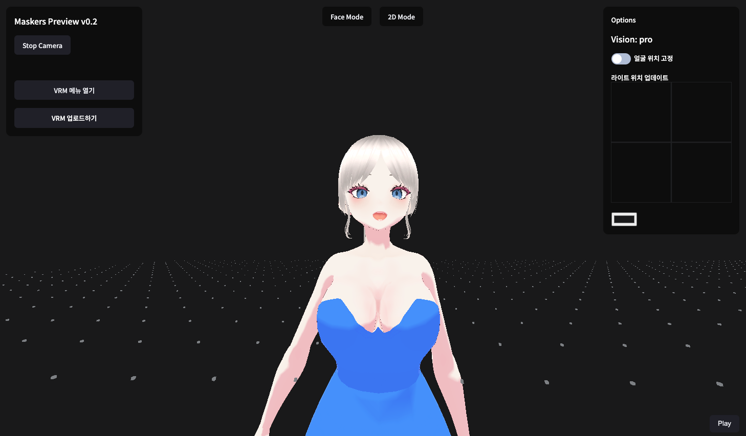 ์๋จ 2D Mode๋ฅผ ํด๋ฆญํด ์ฃผ์๋ฉด ์๋์ ๊ฐ์ด ๋ฒํ๋ฒ๋ก ๋ชจ๋ธ์ด ๋ณ๊ฒฝ๋ฉ๋๋ค. VRM ๋ฉ๋ด๋ฅผ ์ด์ด์ ๊ธฐ๋ณธ ๋ชจ๋ธ์ ์ ํํด ์ค ์๋ ์๊ณ ์ฌ์ฉ์ ์ง์ VRM์ ์ ๋ก๋ํ ์ ์์ต๋๋ค. ์ฐ์ธก์ ๋ผ์ดํธ ์์น ์ ๋ฐ์ดํธ๋ฅผ ๋๋๊ทธํด์ ๊ด์์ ์์น๋ฅผ ์กฐ์ ํด ์ค ์๋ ์์ต๋๋ค. ๋ํ ์ข์ธก ๋ฉ๋ด์์ ์ box๋ฅผ ํด๋ฆญํด ์ฃผ๋ฉด ์์ ๋ณ๊ฒฝ๋ ๊ฐ๋ฅํฉ๋๋ค.